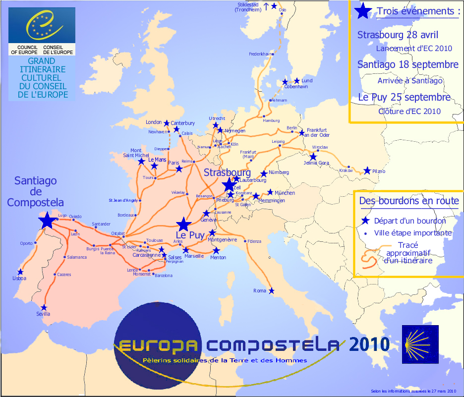 Für ganz Europa sei auf die Homepage der Dachgesellschaft der französischen Jakobusgesellschaften verwiesen. (Übersichtskarte Europa) 28. April 2010 Auftaktveranstaltung unter Mitwirkung des Europarates in Straßburg 3.-10. Juni 2010