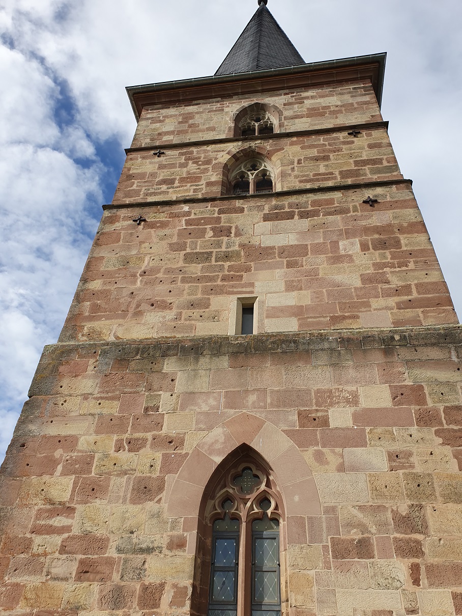 Nach einer Rast in der Pinniger Hütte wurde das Tagesziel dieser rund zehn Kilometer langen Tour in Medelsheim erreicht, nämlich die Kirche St. Martin. Peter Buwen erklärte die Darstellungen des Altarretabel. Hier endete der Weg im Fuße des Kirchturms. Alte wieder freigelegte Fresken, vermutlich aus dem 14. Jahrhundert, konnten dort bestaunt werden. Die Akustik an dieser Stelle wurde für das Abschiedslied genutzt.