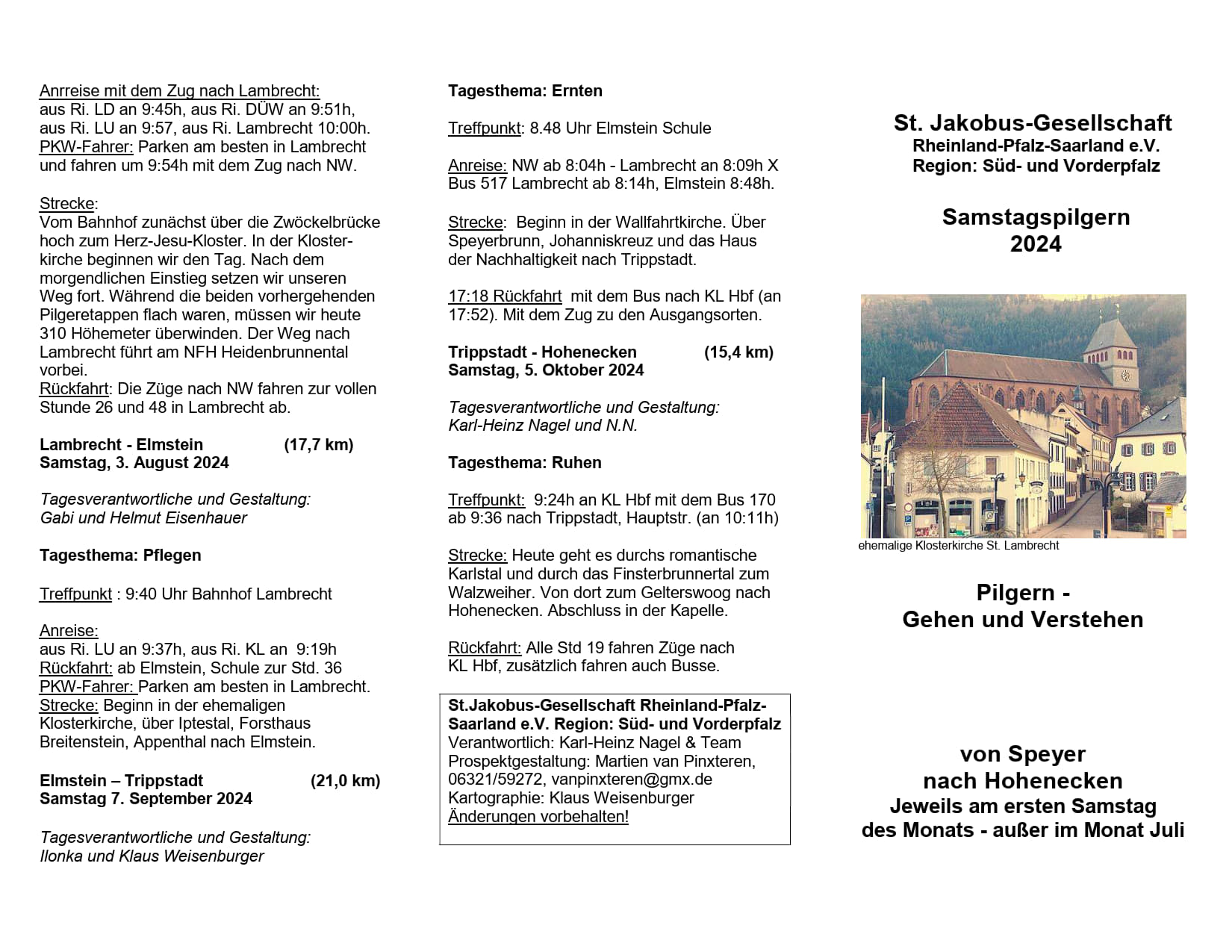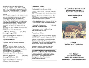 Von April bis September 2024 pilgert die Regionalgruppe immer am 1. Samstag im Monat unter dem Motto: „Pilgern – Gehen und Verstehen“ in Etappen von Speyer bis nach Hohenecken. Weiterführende Infos zu den Terminen werden hier rechtzeitig bekannt gegeben. Auskunft bei Karl-Heinz Nagel und seinem Team.