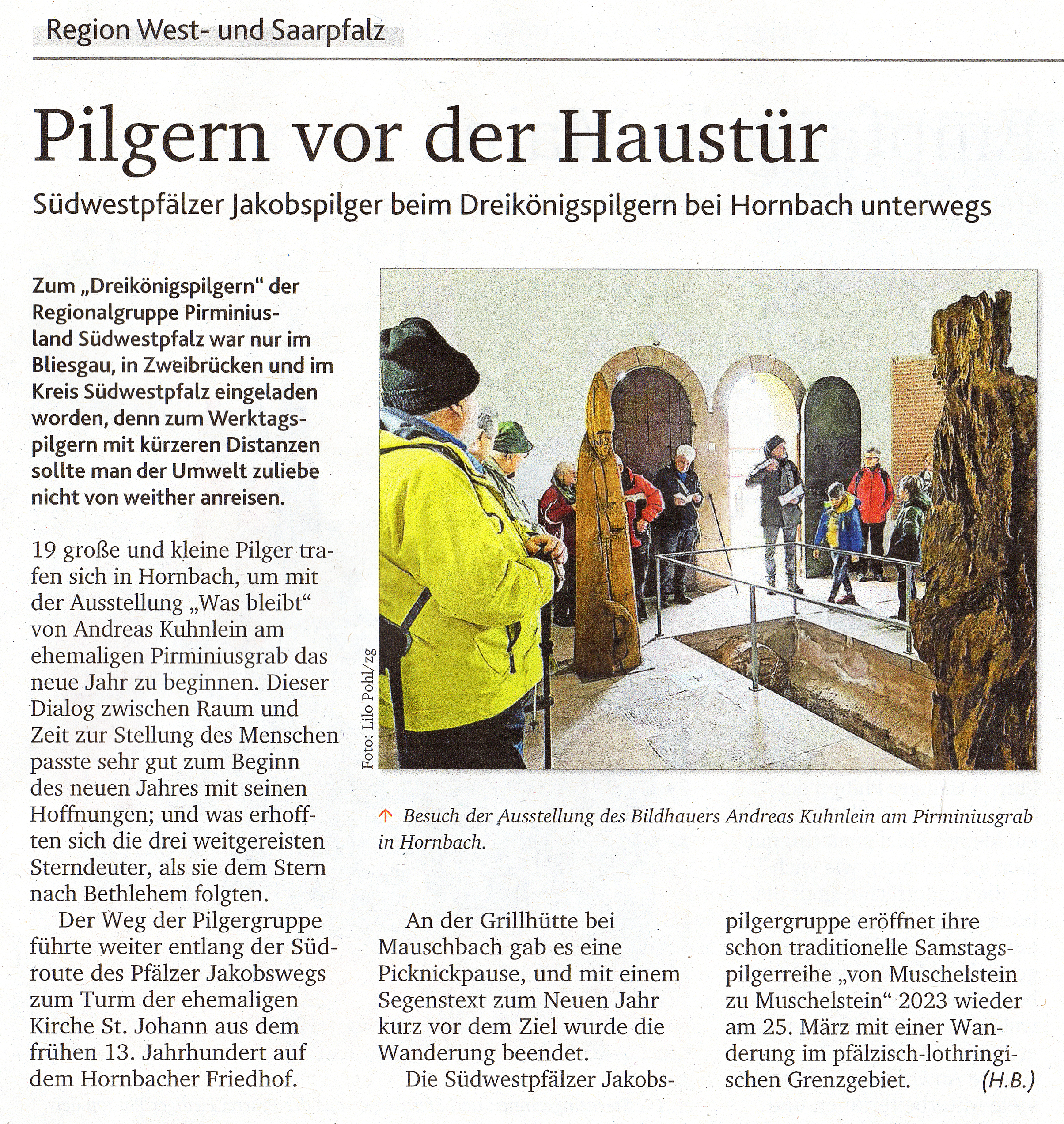 Für das beginnende Jahr haben wir auch schon wieder Pläne: Wir setzen unsere Pilgerwanderungen fort. Das Dreikönigspilgern um Hornbach war die erste, kleine Wanderung; das eigentliche Pilgern „von Muschelstein zu Muschelstein“ beginnt im März, und es folgen fünf weitere Wanderungen in der Südwestpfalz und bis hinüber nach Lothringen. Das Werktagspilgern wird dann im November mit einer Wanderung bei der Martinskirche um Großbundenbach das Jahr 2023 beenden. Um es nicht zu vergessen, unsere Pilgerwanderungen sind nicht auf unsere Mitglieder beschränkt; sie sind für alle offen, gleich welcher Konfession oder Religion, denn: Pilgern verbindet.
