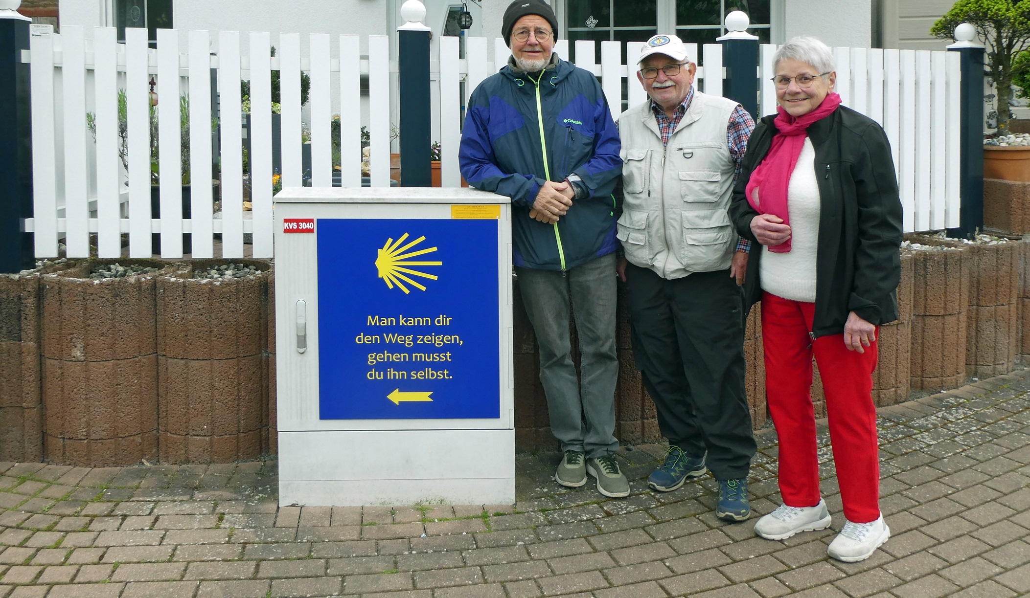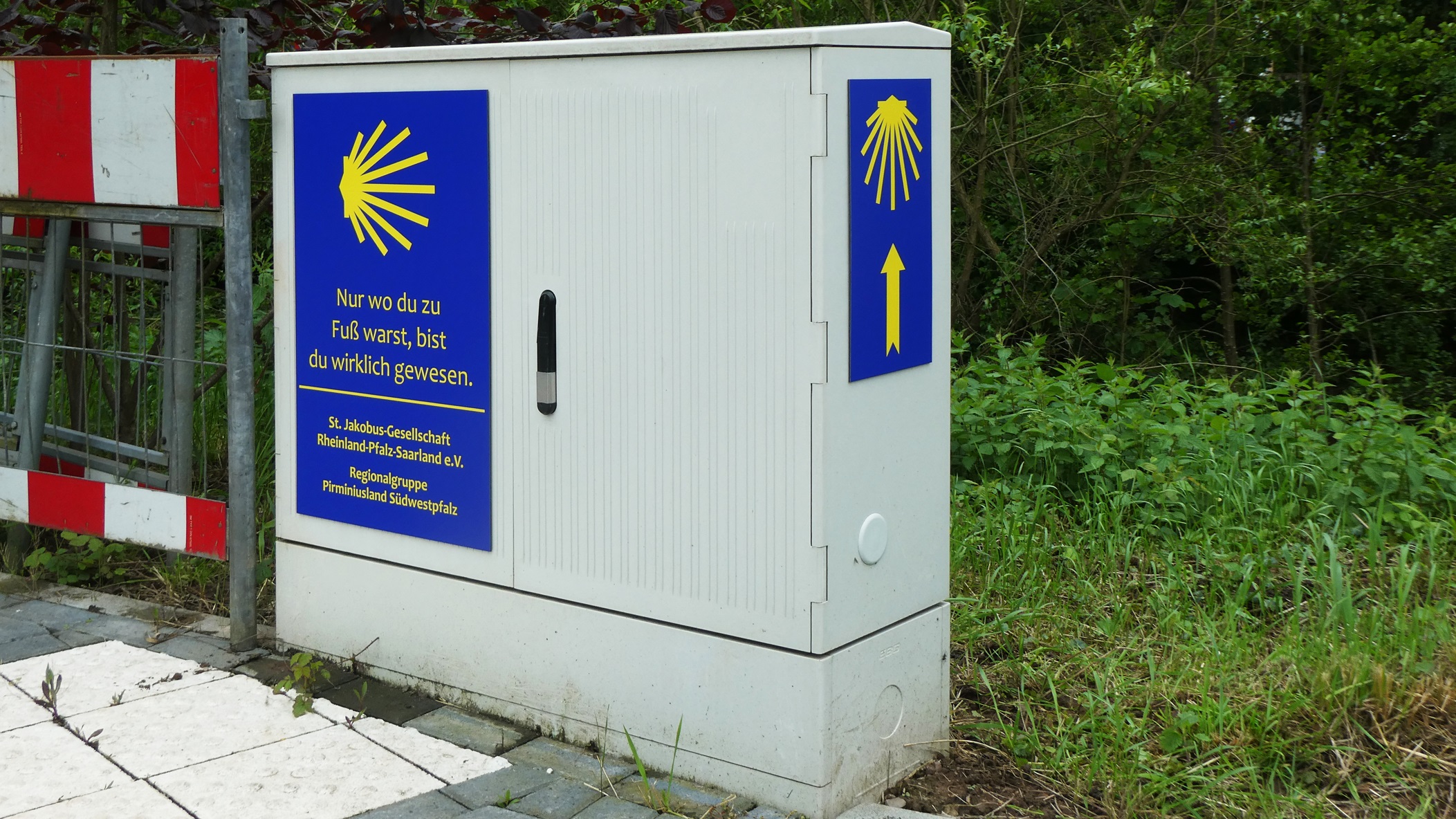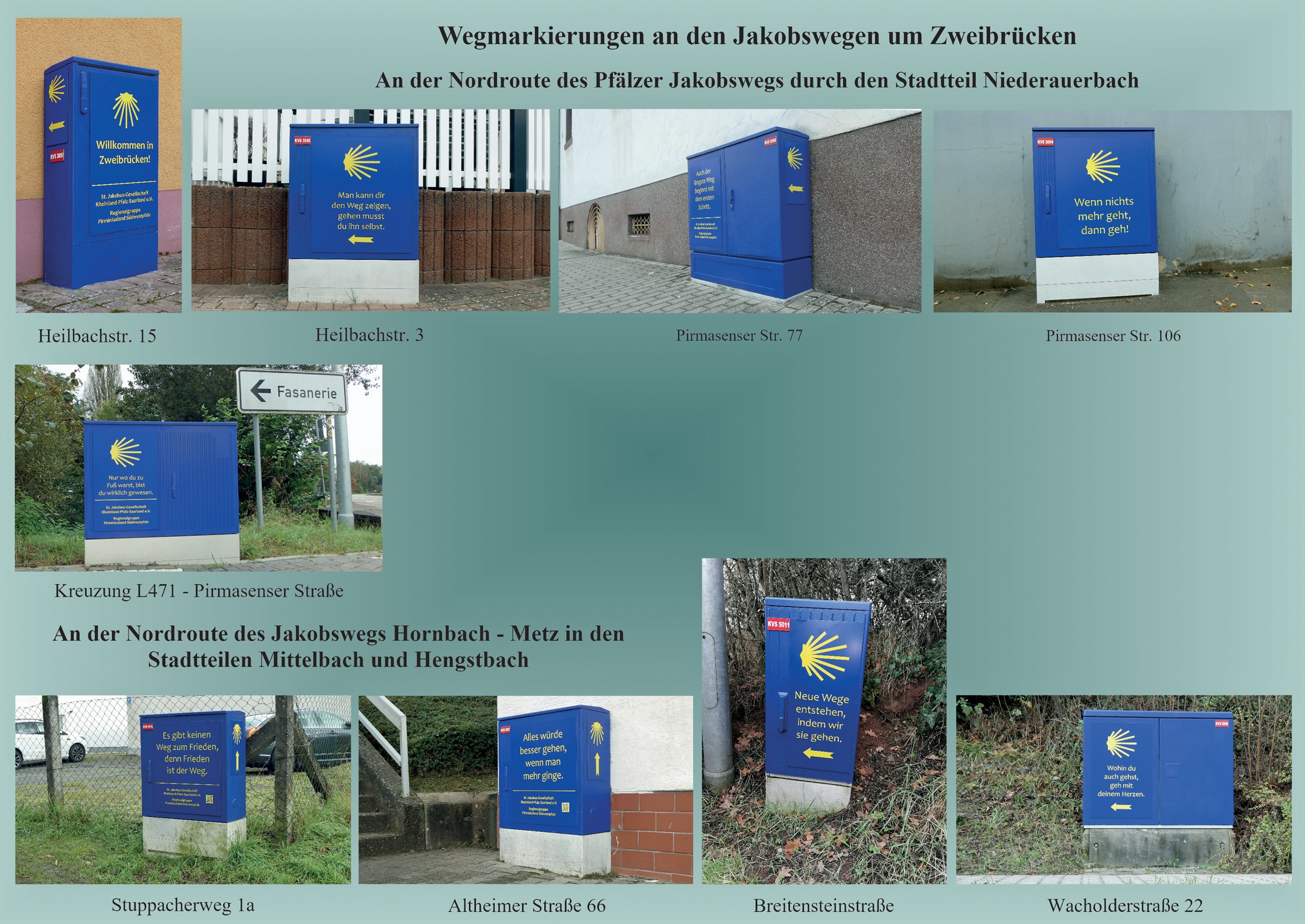 Heute wurden im Zweibrücker Stadtteil Niederauerbach an der Nordroute des Pfälzer Jakobswegs die ersten drei Kabelverteilungskästen als Wegmarkierung und Hinweis auf die St. Jakobus-Gesellschaft und unsere Regionalgruppe mit Schildern versehen. Lothar Klein hatte von einem vergleichbaren Projekt der Jakobusgesellschaft Brandenburg/Oderregion erfahren; die Stadtwerke Zweibrücken stellten sowohl in Niederauerbach als auch in Mittelbach-Hengstbach die Kästen zur Verfügung. Von der Stadtverwaltung erhielten wir ideelle Unterstützung. Die Gestaltung der Schilder wurde vom Planungsteam der Regionalgruppe entworfen. Hergestellt und angebracht wurden die Schilder dann von der Fa. Mayer Werbung in Zweibrücken.