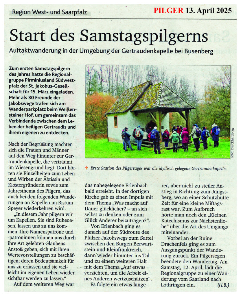 Am letzten Samstag im März 2022 waren Pilgernde wieder „von Muschelstein zu Muschelstein“ unterwegs: Die Regionalgruppe hatte zu einer spirituellen Pilgerwanderung an der Südroute des Pfälzer Jakobswegs von Germersheim zum Dieterskirchel bei Rülzheim eingeladen. Insgesamt waren wir 24 Leute – eine große Gruppe. Einen Monat später waren wir am Hardtrand unterwegs – von Eschbach über die Nikolauskapelle bei Klingenmünster nach Bad Bergzabern. Diesmal waren wir 26 Pilgerinnen und Pilger. In der Vorderpfalz folgten im Juni und Juli dann noch zwei Wanderungen, die jeweils Bad Bergzabern als Ausgangspunkt hatten, einmal nach Wissembourg und zuletzt nach Erlenbach bei Dahn. Nach einer kurzen Sommerpause traf man sich dann wieder im September und Oktober und pilgerte weiter in Richtung des ehemaligen Pirminiusgrabs – von Erlenbach zur Heilsbach bei Schönau und zuletzt von Ludwigswinkel nach Eppenbrunn.