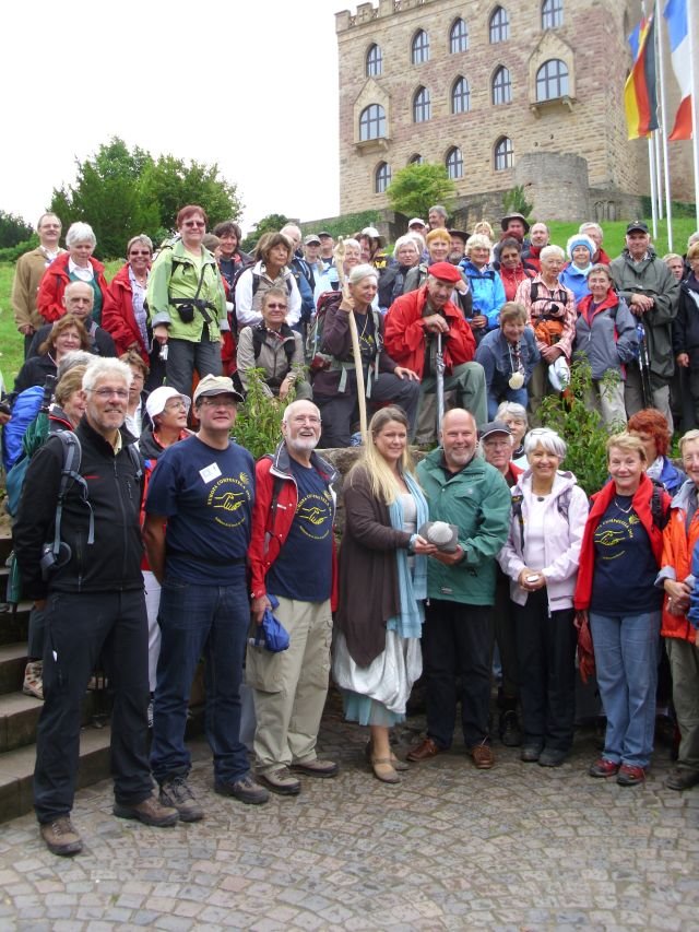 Nun noch kurz zu den Veranstaltungen um den Patronatstag des Hl. Jakobus (25. Juli 2011) herum: Die Sternenwanderung in der Süd- und Vorderpfalz hat 120 Pilger angezogen, die mit gegangen sind, wie die Presse berichtet. Auch unsere elsässischen Jakobusfreunde waren gekommen. Einer der Höhepunkte war das Setzen des durch Diebstahl verloren gegangenen Muschelsteins vor das Hambacher Schloss. Davon kann ich Ihnen ein Foto zeigen.